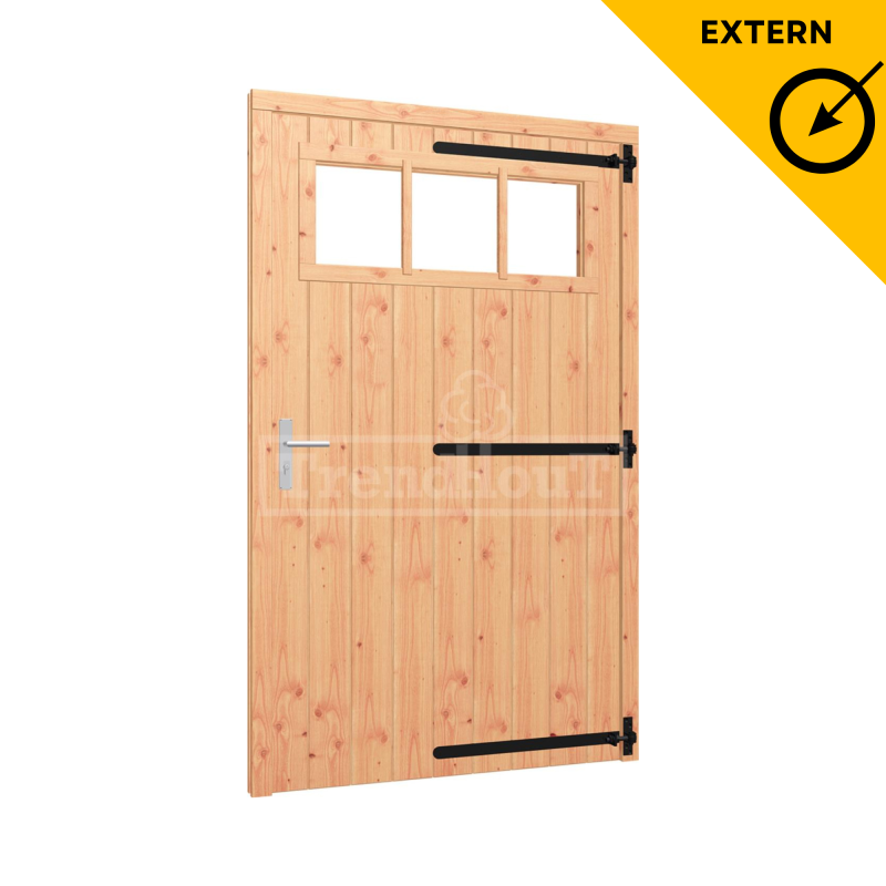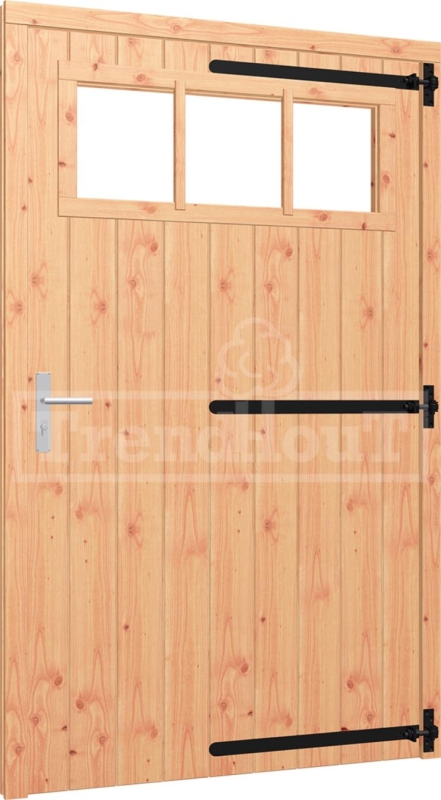 Opgeklampte deur XL van onbehandeld douglashout met bovenraam van enkelglas met losse voorzetroedes (zelf te monteren). Rechtsdraaiend.