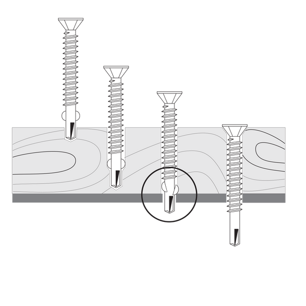Met deze schroeven is het niet nodig om hout of staal voor te boren. De vleugels van de schroeven boren het hout voor en voorkomen dat het schroefdraad volloopt, vervolgens boort de boorpunt een gat in het staal. De vleugels breken af zodra ze het staal raken. Het schroefdraad tapt zich vervolgens in het staal en trekt het hout aan. De freesribben onder kop van de schroef zorgen voor een mooie verzinking in het hout.
